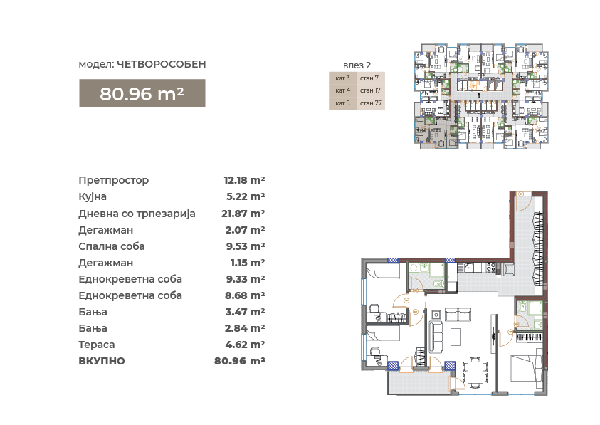 Во северниот дел на Скопје, во населбата Шуто Оризари, на фреквентна и видна локација создадовме нов атрактивен станбено-деловен објект со хармонична и топла нота која плени како однадвор, така и одвнатре. Идеално место за живеење кое нуди вистинско уживање за сечиј вкус задоволувајќи ги сите потреби и желби со модерни и луксузни услови за домување.